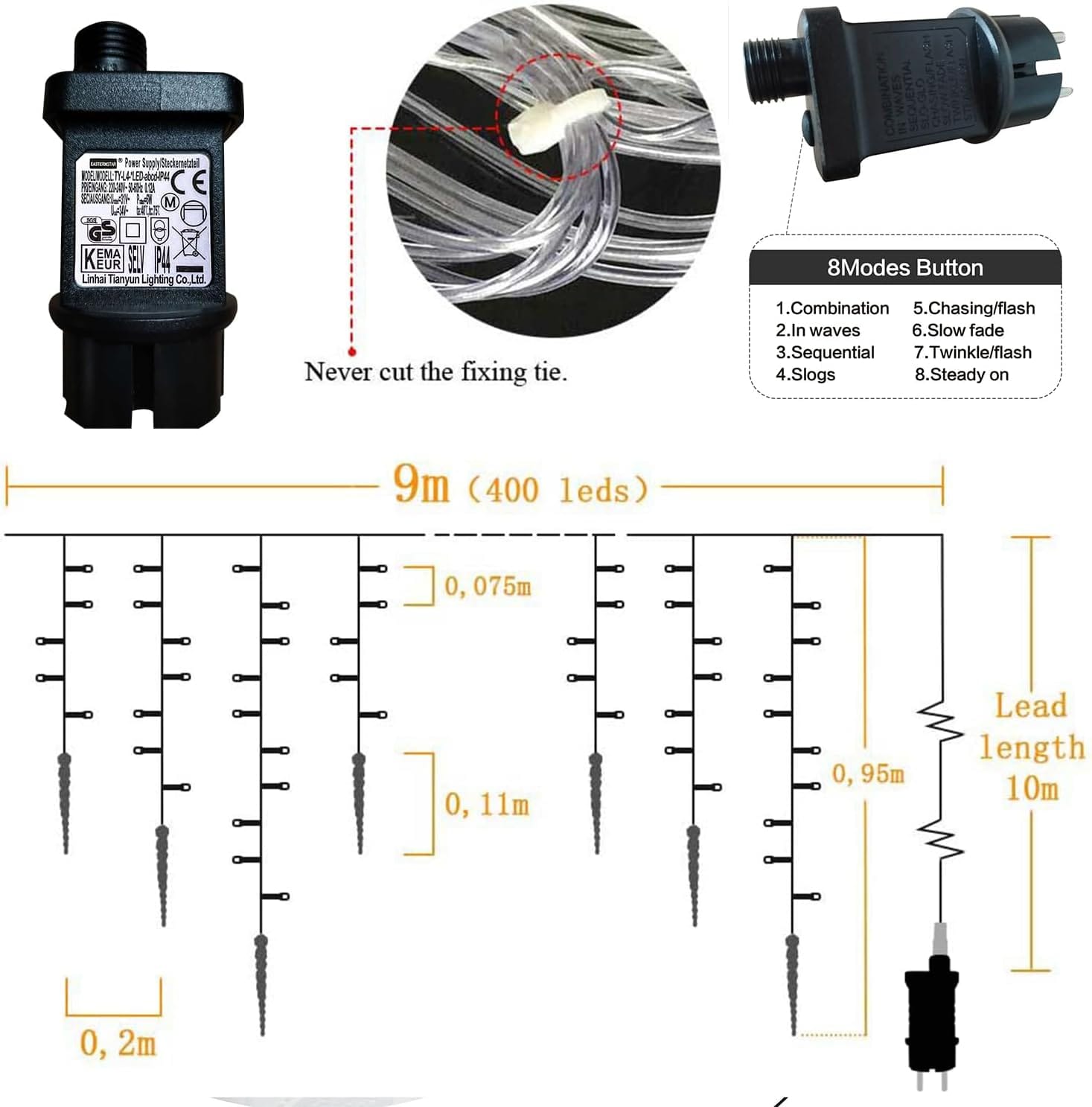 - 400 LED en 10 m ofrecen una cobertura generosa para decorar paredes, cortinas o enredaderas.